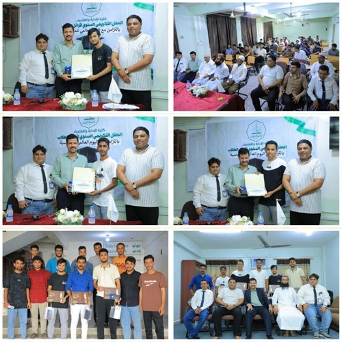وقدم الاستاذ محمد أنيس مكنون ممثل عن شركة إنفوسوفت للبرامج المحاسبية، بعض الهدايا التذكارية الرمزية للطلاب الأوائل دعماً وتشجيع لهم، وقد عبّر الطلاب المكرمون عن سعادتهم بهذا التكريم الذي يعكس حرص الكلية على دعمهم وأعضاء هيئة التدريس على جهودهم في تهيئة بيئة تعليمية محفزة وداعمة للإبداع والتميز.