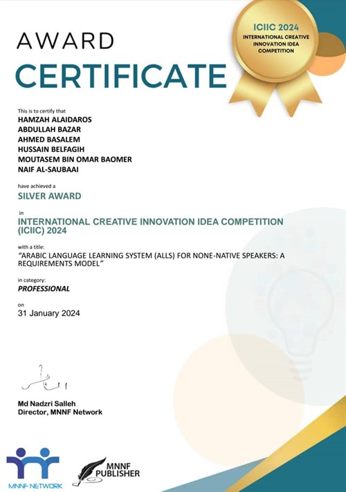 استلمت كلية هندسة وعلوم الحاسوب بجامعةُ الأحقاف يوم الثلاثاء 13 فبراير 2024 شهادات المشاركة في المسابقة الدولية لأفكار الأبتكار الإبداعي (ICIIC2024) التي نظمتها شبكة MNNF أواخر الشهر الماضي كما استلمت أيضا شهادات الفوز بميداليات ثلاث، ميداليتين فضيتين وأخرى ذهبية عبر الموقع الرسمي لشبكة MNNF ، نظير مشاركة ثلاثة مجموعات من طلاب قسم تقنية المعلومات بكلية هندسة وعلوم الحاسوب المجموعات الثلاث شاركت بأفكار ثلاثة مشاريع ريادية إبداعية في المسابقة تم الاعلان عن فوزها الأربعاء الماضي 31 يناير 2024.
